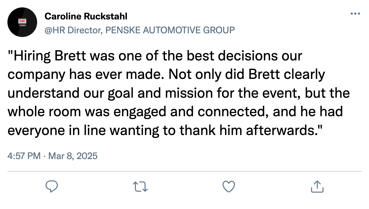 • Brett delivers keynotes that don't just inspire - they reset the room. With a focus on clarity, alignment, and sustainable performance, his talks help leaders and teams rethink success and walk away with practical, lasting shifts.